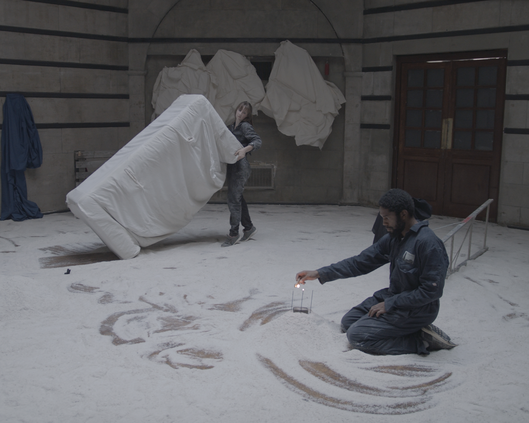 Traces of an Absent Body took place at The Lethaby Building (Round Room). It was a collaborative project between three artists: sharing their practices across film, installation, sound and performance. It was an attempt at listening and responding to the nature of the space; its scale, sonorities, and its present and future existence. The work drew from tyroneisaacstuart’s investigations into sound and reverberation, the text of Sarah’s previous performance lecture Touch Me Not, and Nikolai Azariah’s ongoing research into the symbolic nature of salt as a substance and a mythology.